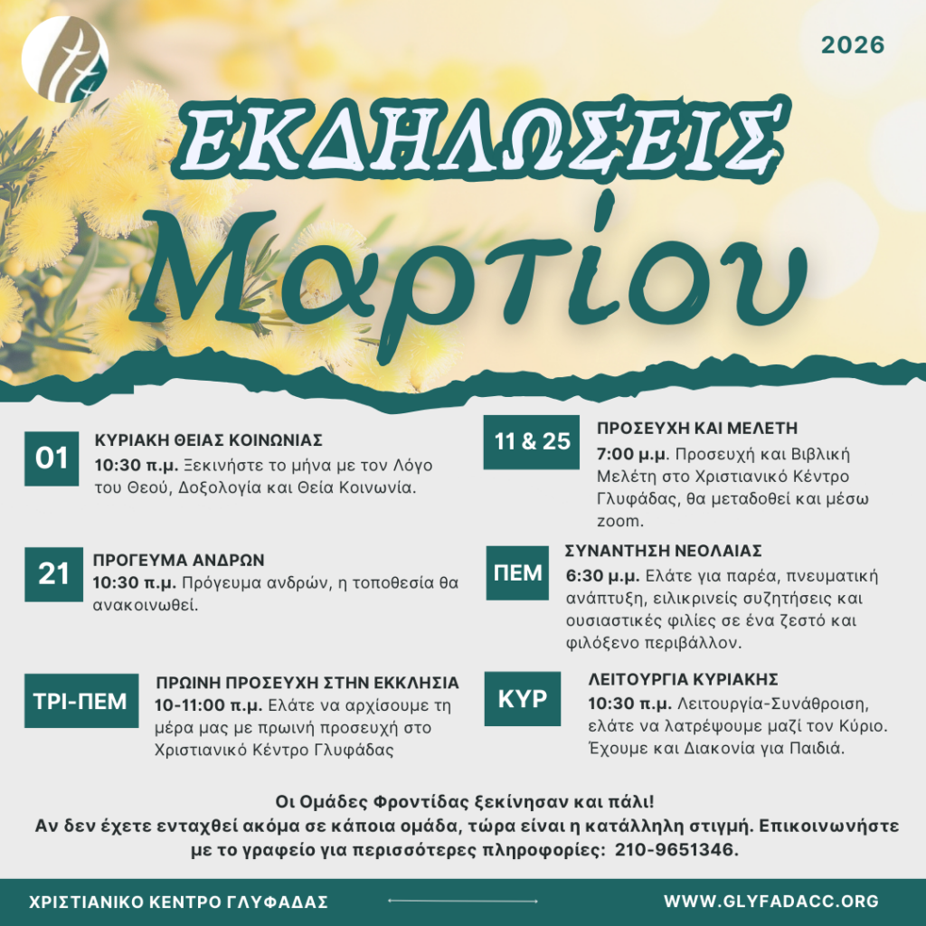 Κάθε 2η & 4η Τετάρτη συναντιόμαστε στο κτίριο της εκκλησίας και μέσω Zoom. Ημερομηνίες Μαρτίου: 11 & 25