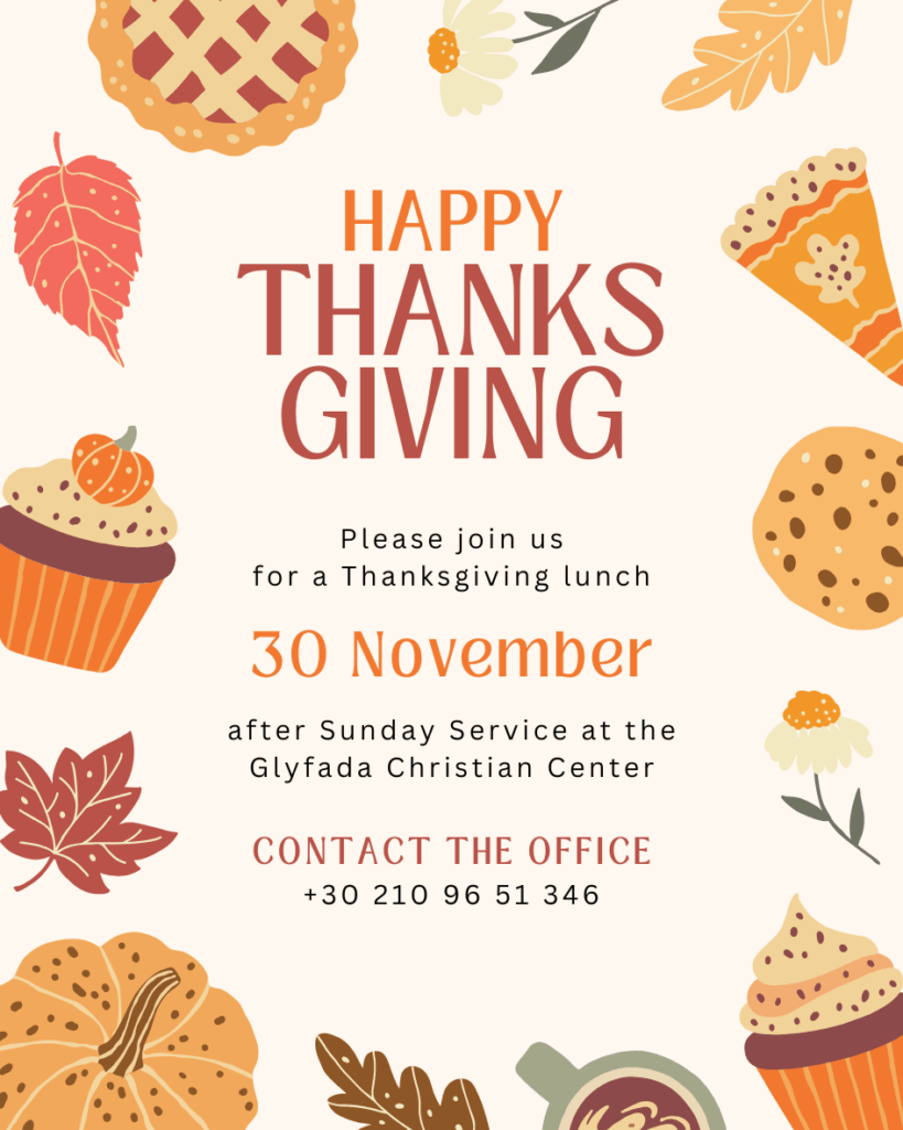 Join us on Sunday, November 30 for a warm and joy-filled Thanksgiving Lunch immediately after our 10:30 a.m. service. Let’s gather as a church family, share a meal, give thanks for God’s goodness, and enjoy fellowship together.